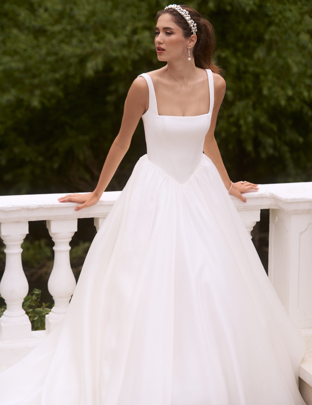 Our gowns combine classic bridal elegance with contemporary style — including structured corsetry, feminine textures, and architectural lines. The result: effortlessly glamourous designs made to turn heads from every angle.