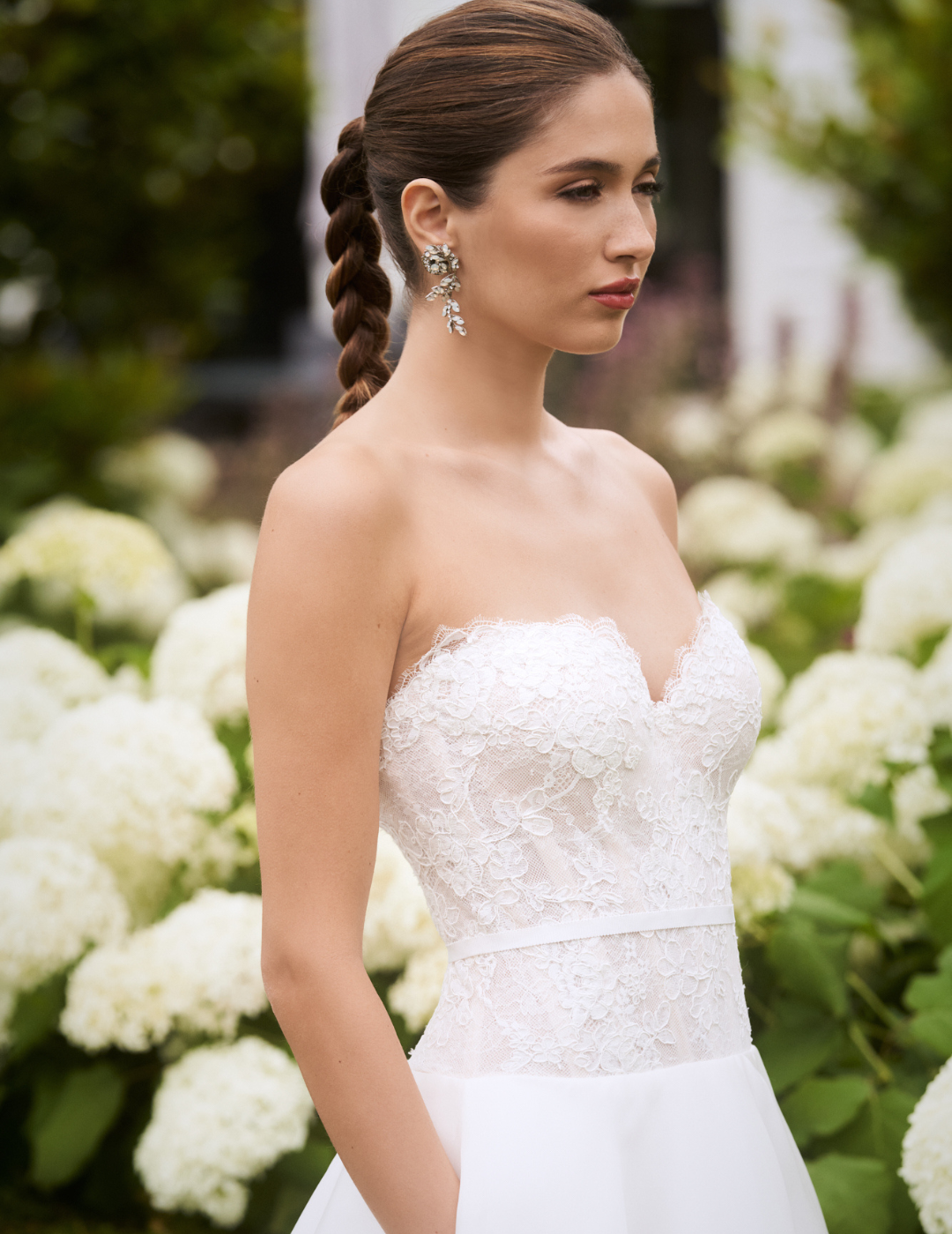 Featuring a French corded lace bustier in stretch power mesh for a flawless fit, it’s paired with a full circle-and-a-half silk organza skirt and elongated drop waist. Timeless, fashion-forward, and exquisitely detailed.
