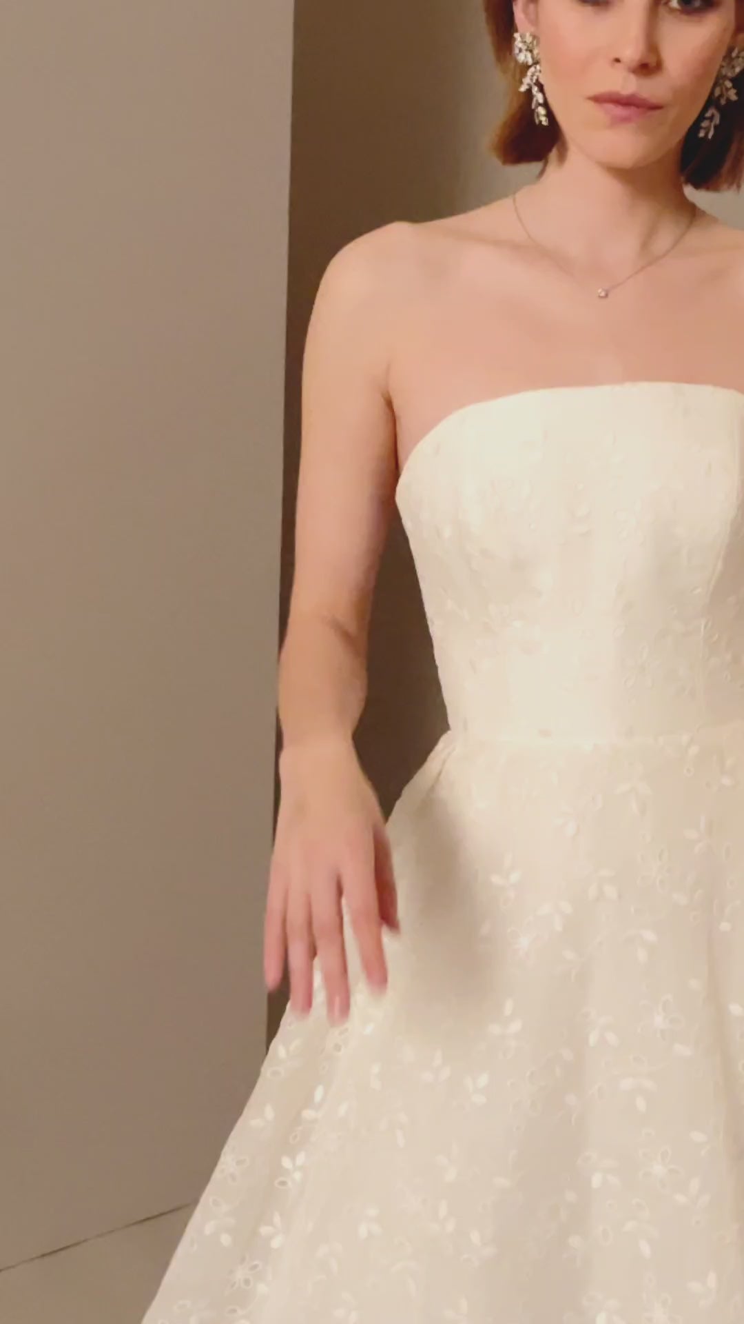 Indulge in the grandeur of ‘Brigitte’. Crafted from sumptuous, embroidered silk organza, ‘Brigitte’ showcases a classic yet modern silhouette, featuring a straight neckline corset that accentuates the bride's natural beauty.