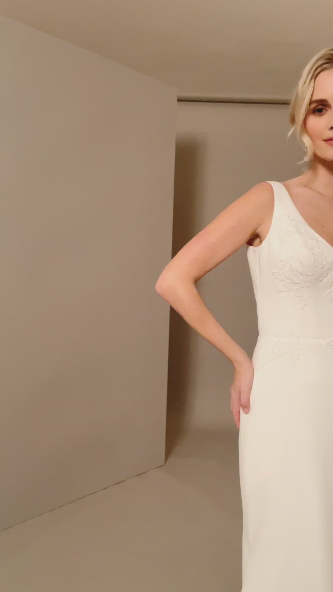 The smooth and flowing crepe fabric drapes elegantly, setting the stage for a gown that is effortlessly refined.